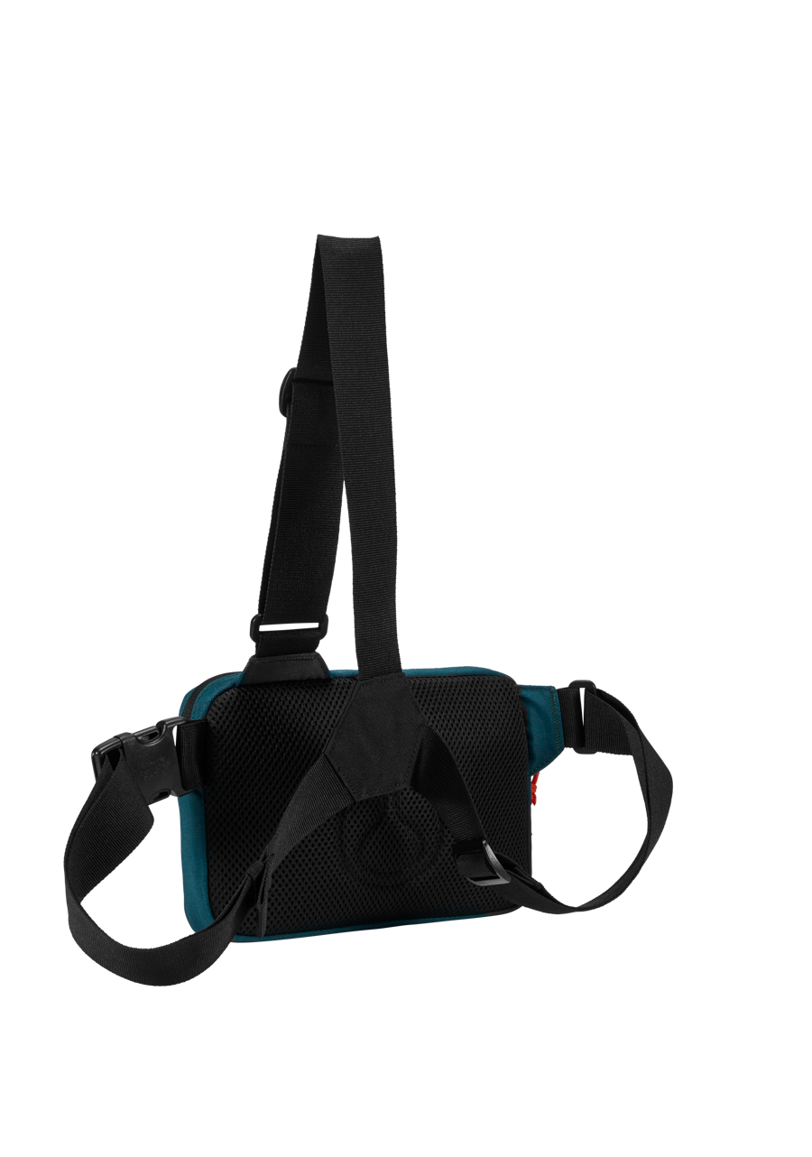 Breathable mesh back panel facilitates airflow and cuts down on sweat. Front-facing harness design adds style to the functionality and security of the Bandit. Internal and external zippered pockets and internal organizers like a key clip and slip pockets.