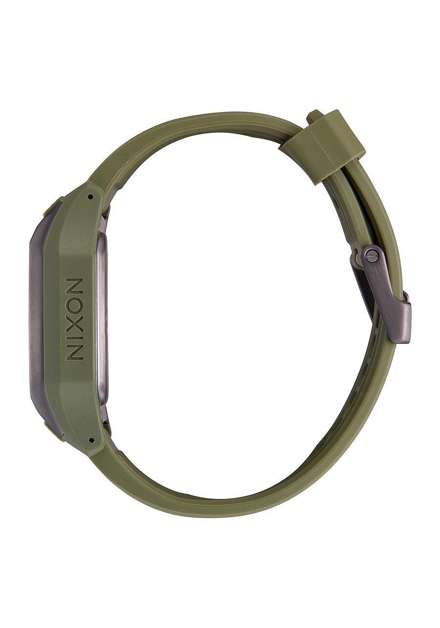 The Nixon High Tide watch is designed to be highly comfortable and durable. The strap is a rubber blend that is injection-molded for maximum wearability and secured by a double-locking looper. This design, similar to a high-quality wetsuit, supports both daily wear and use under wetsuits, providing a comfortable fit during surfing activities with its 100 meter / 10 ATM water rating.