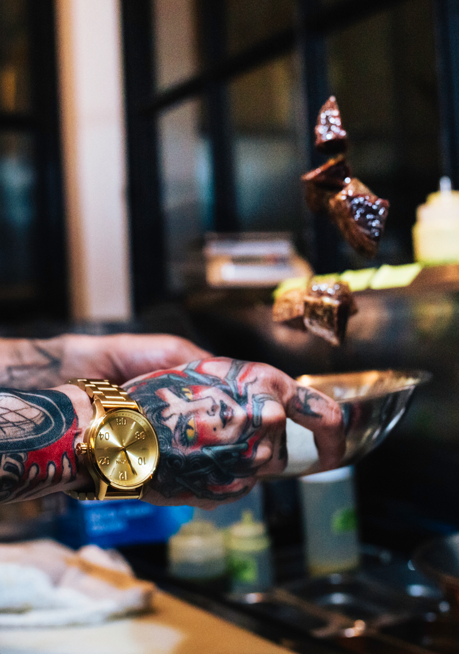 42mm custom solid stainless steel case with a 100 meter / 10 ATM water rating. Comes with a hardened mineral crystal, stainless steel screw down caseback and spring pin lugs.