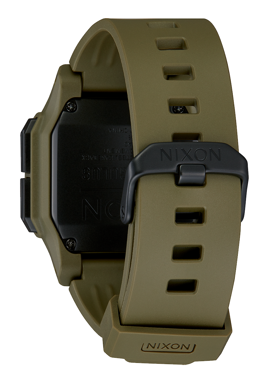 The Nixon Regulus is a highly durable watch with resistance to both water and shocks. We used Poron foam between the watch's brain and case, which acts as a shock-blocking shell. The watch is encased in a protective PU jacket and includes Poron foam padding for added shock absorption and durability. The Regulus also boasts a robust molded rubber strap and a stainless steel buckle, adding to its ruggedness and durability.