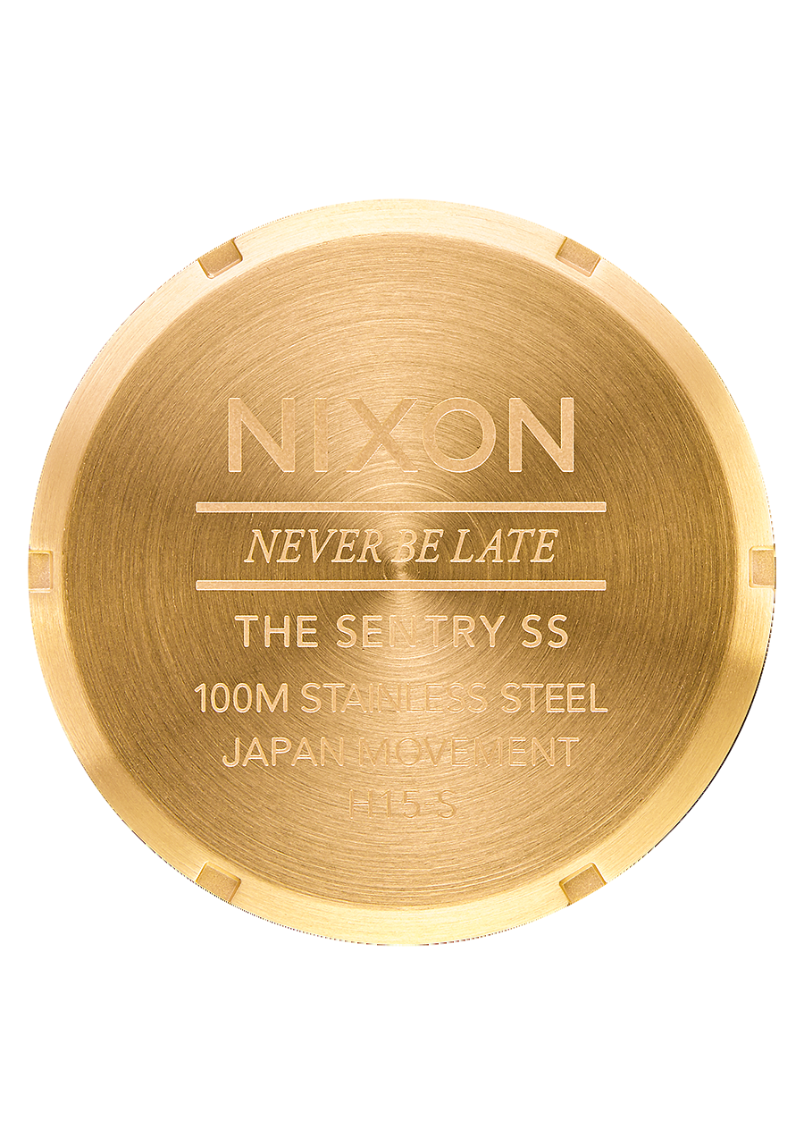 The Nixon Sentry Stainless Steel watch uses a Japanese Miyota 2305 quartz 3-hand movement and features a bilingual day and date function in English and Spanish.