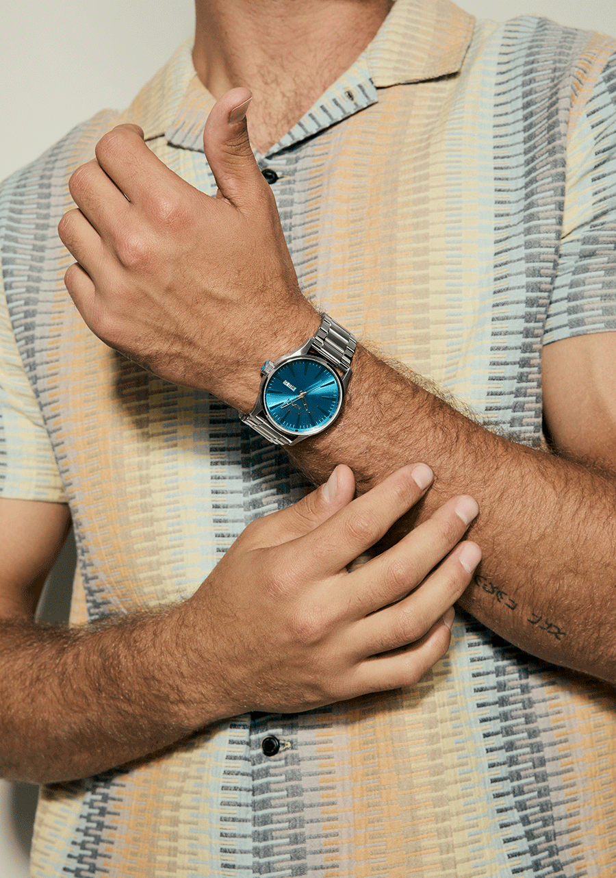 Kick back poolside for the day with the all-new Aquatic Collection. Featuring the Time Teller, Sentry Stainless Steel, and dive inspired Stinger 44, these classic silver watches get filled with vibrant and rich blues to accompany your journey from the lounge chair all the way to the deep end.
